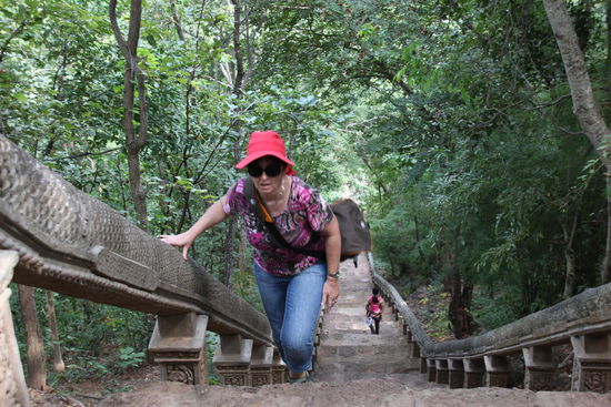 Danach geht es weiter auf den Berg Phnom Banan. Hier müssen wir eine ziemlich steile und hohe Treppe hinaufsteigen, um zu den 5 Prasats (Türmen) zu gelangen. Diese wurden Mitte des 11. Jahrhunderts erbaut. Sie sind in einem schlechten Zustand und wurden im hohen Maße Opfer von Kunstraub und Vandalismus. Dafür ist der Blick ins Tal sehr schön. Wieder unten angekommen fahren wir zurück ins Hotel.