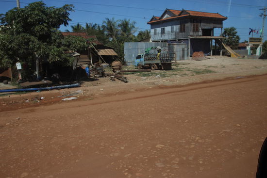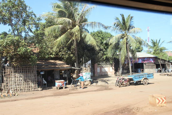 Unser Wecker klingelt um 5:30 Uhr. Heute fahren wir weiter nach Siem Reap. Wir duschen schnell und machen uns auf den Weg zu einem nahe gelegenen Bäckergeschäft, wo wir uns mit etwas Reiseproviant eindecken. Danach frühstücken wir. Es gibt für jeden Müsli mit Obst und Joghurt, ein Teller mit exotischen Früchten und ein Bananen-Mango Smoothie. Dazu Kaffee oder Tee. Anschließend holen wir unser Gepäck aus dem Zimmer und bezahlen unsere Rechnung. Danach müssen wir noch sehr lange warten bis unser Bus zur Abholung kommt. Kurz vor 9:00 Uhr werden wir vom Hotel von einem überfüllten Kleinbus abgeholt. (Um 8:45 Uhr sollten wir schon auf dem Weg nach Siem Reap sein). Wir werden zum örtlichen Busbahnhof gebracht, wo wir noch auf weitere Fahrgäste warten müssen. Um 9:20 Uhr fahren wir endlich los. Leider haben wir wie immer nur Sitze in der hinteren Reihe bekommen. Das ist aber auch nicht schlimm, denn so haben wir eine gute sich aus dem Fenster und können auch gut fotografieren. Wir fahren an den Außenbezirken Phnom Phens vorbei, wo viele Handwerker in ärmlichen Hütten wohnen.