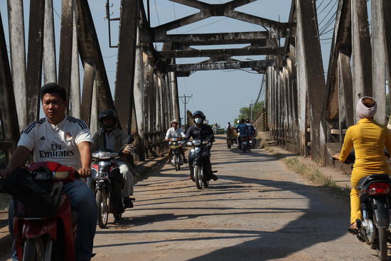 Heute fahren wir weiter nach Takeo. Um 7:15 Uhr gehen wir frühstücken, mit Weißbrot, Butter, Marmelade und schwarzem Tee. Die Franzosen sind schon fast fertig mit dem Frühstück, sie werden ja auch schon um 8:00 Uhr abgeholt. Andy der Schotte und wir fahren erst um 8:30 Uhr los. Da wir schon alles gepackt haben, lassen wir uns Zeit mit dem frühstücken und bezahlen anschließend unsere Rechnung bei Marco. Der Taxifahrer ist pünktlich und wir starten um 8:20 Uhr nach Kampot. Wir fahren am Bokor-Nationalpark vorbei, wo die Chinesen ein riesiges Hotel mit über 600 Betten und ein Spielcasino oben auf dem Berg bauen. Um 9:30 Uhr kommen wir in Kampot an, wo wir zuerst Andy in seinem neuen Hotel abladen. Danach fahren wir weiter zum Fluss, von wo aus wir unsere zweistündige Stadtbesichtigung starten. Zuerst gehen wir an der alten schmalen Eisenbrücke aus der französischen Kolonialzeit vorbei, die mittlerweile nur noch von Mopeds und Fahrrädern befahren werden kann.