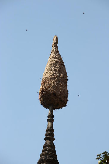 Wir laufen weiter bis zum Durianmonument. Durian ist eine Baumfrucht, die hauptsächlich neben dem Pfeffer, in dieser Umgebung angebaut wird. Danach geht es weiter zum Wat Kampong Bay, einem alten Kloster mit vielen Stupas (Grabstätten), die rund herum gebaut sind. Auf der Spitze eines Stupas haben Bienen oder Wespen ein riesiges Wespennest gebaut.