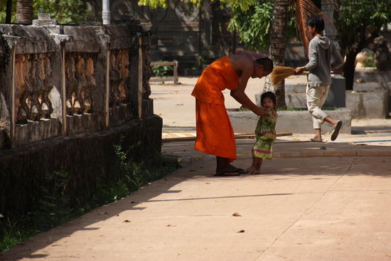 Beim Verlassen des Geländes treffen wir auf einen Mönch, der sich freut, dass er sich ein wenig mit uns unterhalten kann.