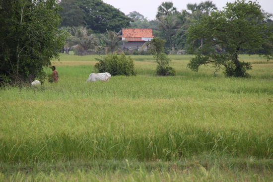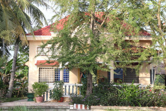 Als wir im Taxi sind fängt es an zu regnen und wir sind froh, dass wir im trockenen sitzen. Nach ca. einer Stunde Fahrt kommen wir im Mea`s Family Homestay an und werden herzlich empfangen. Es ist ein großes Anwesen, mitten in Reisfeldern gelegen.