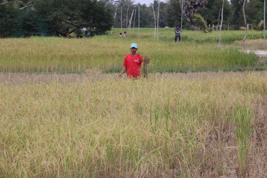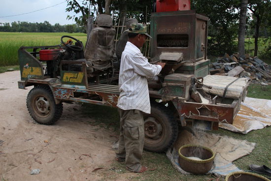 An Bauern vorbei, die ihre Reisfelder abernten, in einem anderen Hof wird der Reis mit Hilfe einer Maschine geschält. Hier bleiben wir eine Weile stehen und schauen zu.