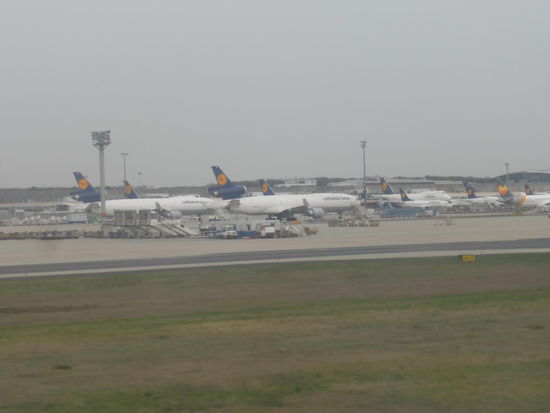 Vorne links eine Etihad in der mitte Sri Lankan Air und am Ende eine Maschine der Cathay Pacific aus Hong Kong in Frankfurt
