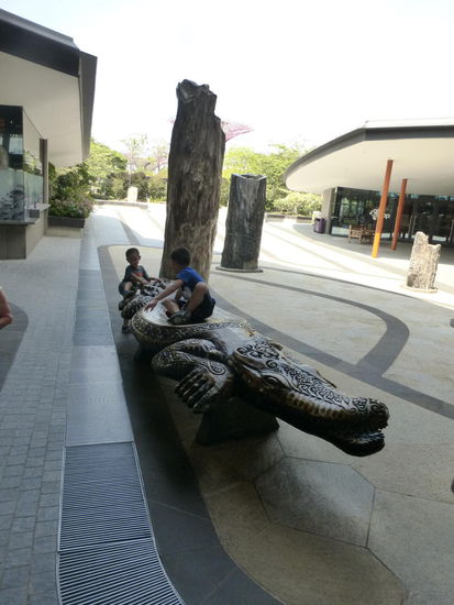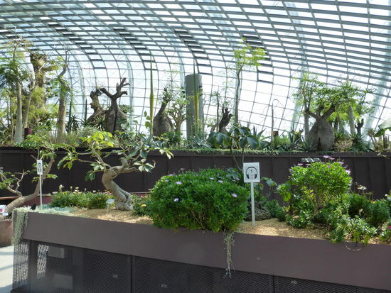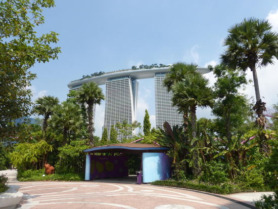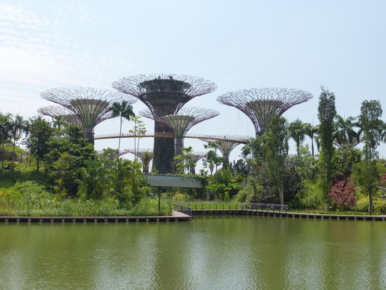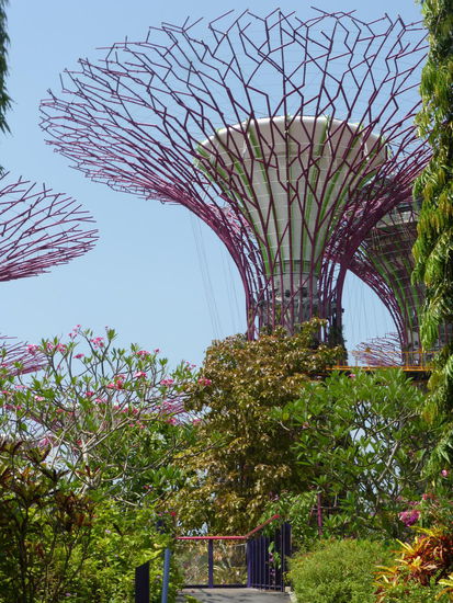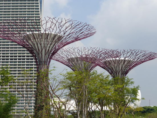 Die " Gardens by the Bay " gehören zu den zahlreichen neuen Attraktionen der Stadt und sollen einmal der attraktivste botanische Garten der Welt werden. Ich denke das es durchaus realistisch ist dieses Ziel in naher Zukunft zu erreichen. Dieser Garten ist aber nicht zu verwechseln mit den " Singapore Botanic Gardens " mit seinen berühmten Orchideen Gärten der schon 1859 eröffnet und heute sogar zum UNESCO WELTKULTURERBE gehört. Aus Zeitgründen hatte ich mich diesmal aber für die Gardens by the Bay entschieden was aber sehr selten ist denn bis auf sehr wenige Ausnahmen lasse ich eigentlich keine Welterbestätten aus. Die bis zu 50 m hohen " Supertrees " ( künstliche Bäume ) leuchten am Abend was sehr schön ausschaut und am Tage spenden sie etwas Schatten und dienen auch als Wasserspeicher.