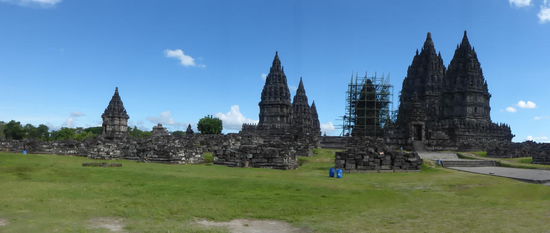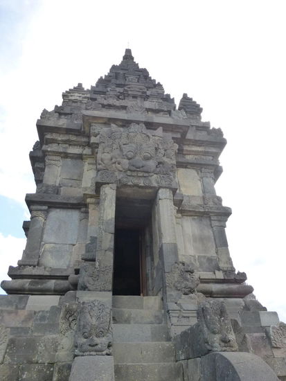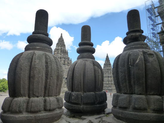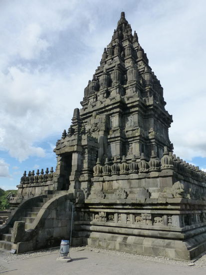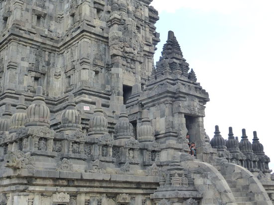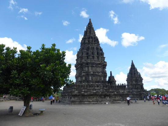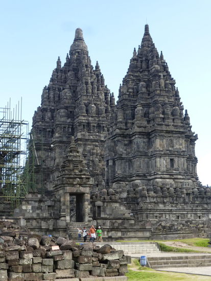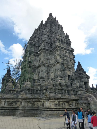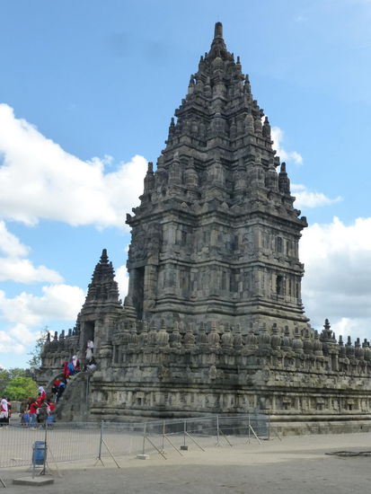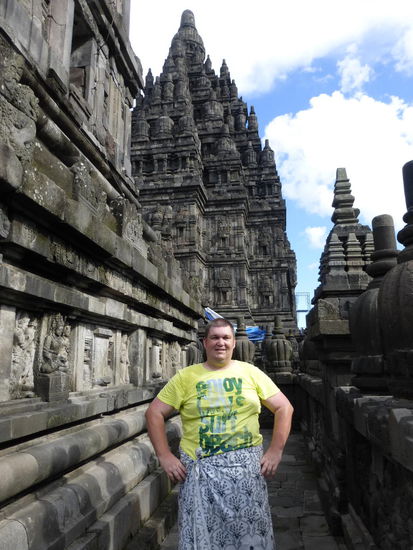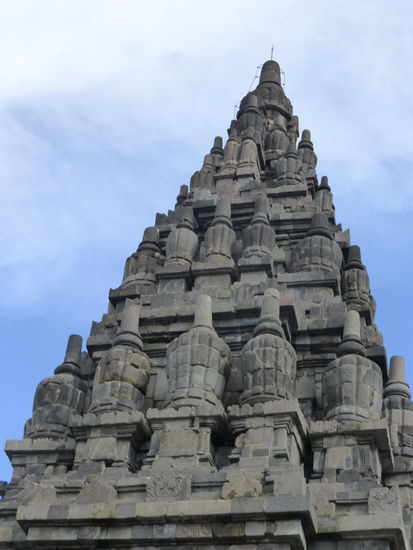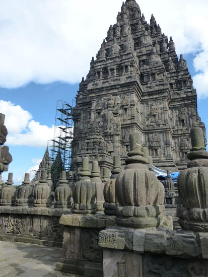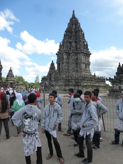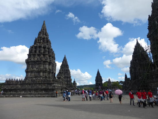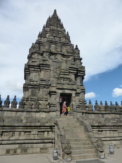 Das zweite große Highlight für mich in der Umgebung von Yogyakarta sind die hinduistischen Tempel von Prambanan die 20 km östlich der Stadt liegen und zu Ehren des Hindugotts Shiva im späten 9. Jh. errichtet wurden. Zu der dreistufigen Anlage gehören 8 Tempel von denen die 3 Haupttempel nach den hinduistischen Göttern Shiva , Vishnu und Brahma benannt sind. Schon kurze Zeit nach Vollendung der Bauarbeiten wurden die Tempel wieder aufgegeben und erst ab 1918 langsam wieder aufgebaut und restauriert. Sowohl im 16. Jh. als auch in neuerer Zeit zuletzt 2006 wurde die Tempelanlage immer wieder stark durch Erdbeben in Mitleidenschaft gezogen. Durchaus typisch für Hindutempel ist die hohe und spitzenartige Bauform die ich ja auch schon in Indien bewundern konnte. Prambanan gehört seit 1991 zum UNESCO WELTKULTURERBE.