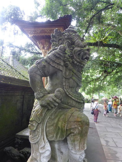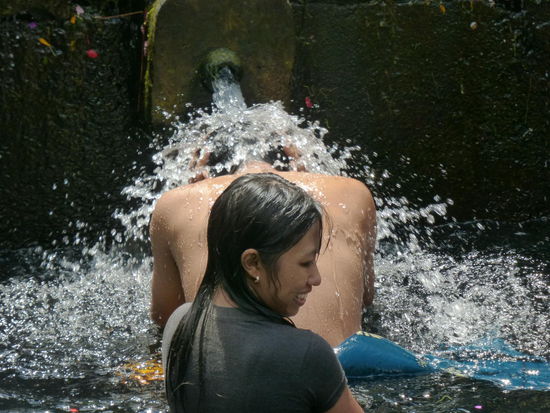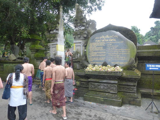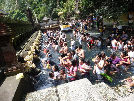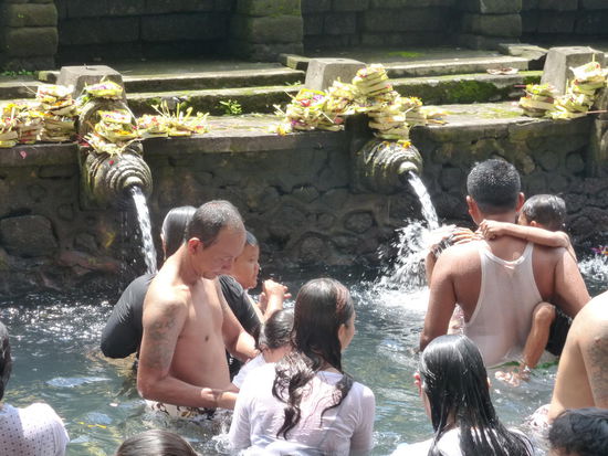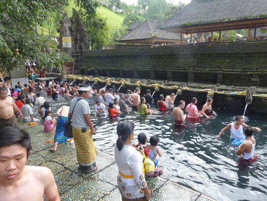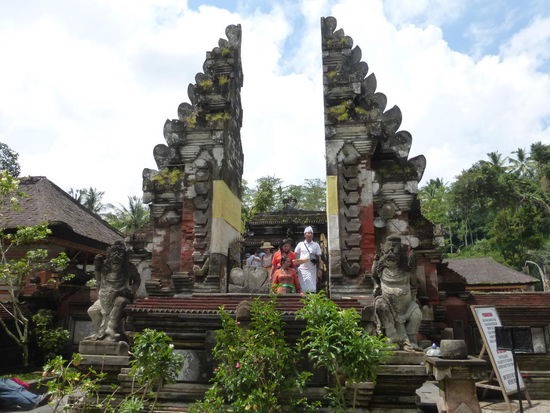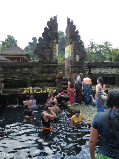 Der Tirta Empul Tempel wurde vor ca. 1000 Jahren zu Ehren des Hindu Gottes Vishnu an einer Wasserquelle erbaut in der bis heute Balinesen baden da dem Wasser eine heilende Wirkung zugesprochen wird. Neben den Blumenblüten die überall zu sehen sind sollen sich auch Kois im Wasser befinden. Einige Besucher kommen sogar mit Flaschen und Kanister um etwas von dem heiligen Wasser mit nach Hause zu nehmen und auch der ehemalige indonesische Präsident Sukarno besuchte die heiligen Quellen am Tempel mehrmals. Der Tirta Empul Tempel gehört seit 2012 zum UNESCO WELTKULTURERBE " Kulturlandschaft Bali "