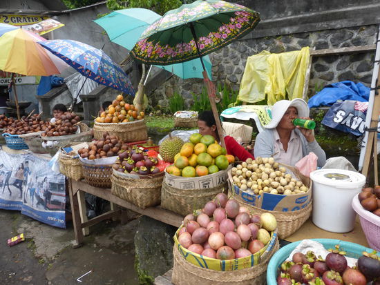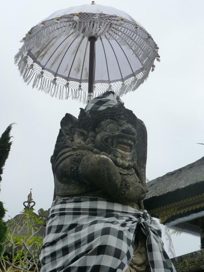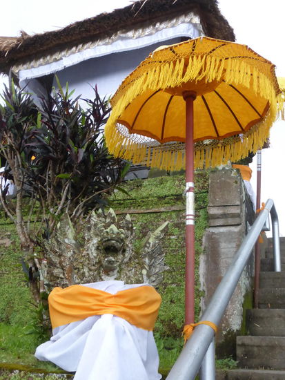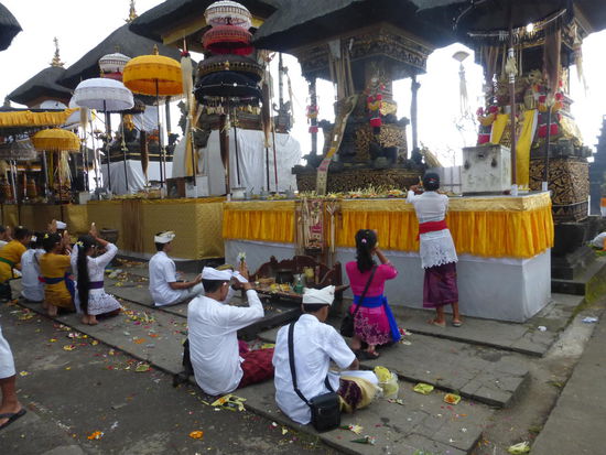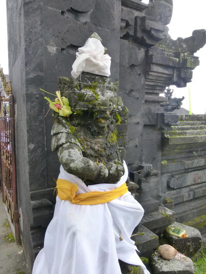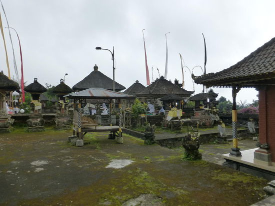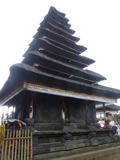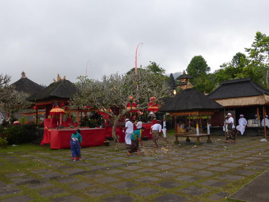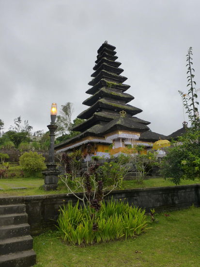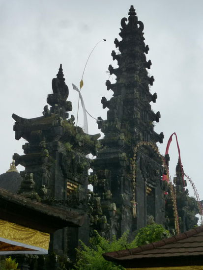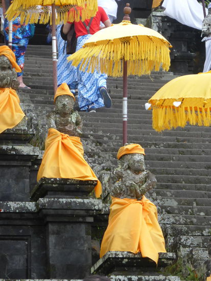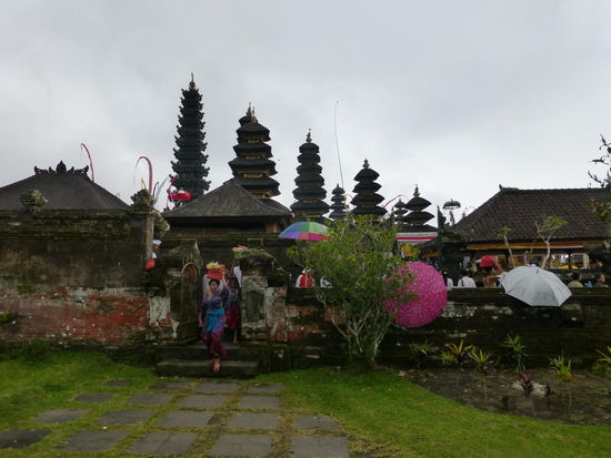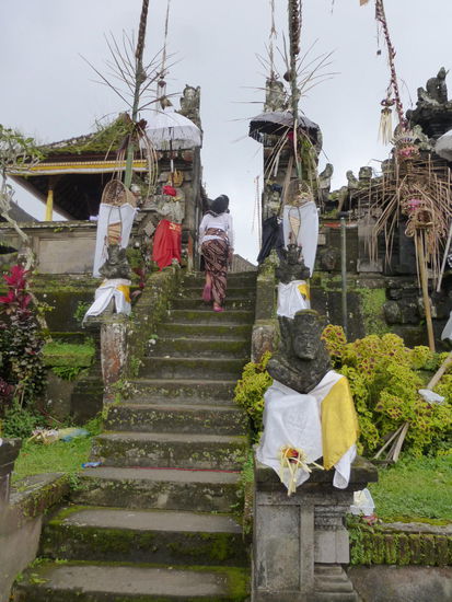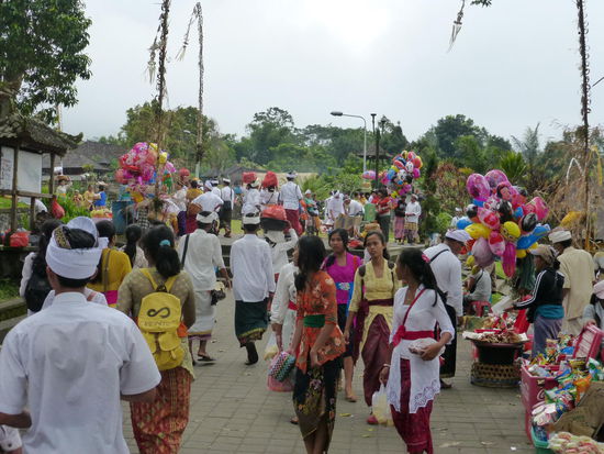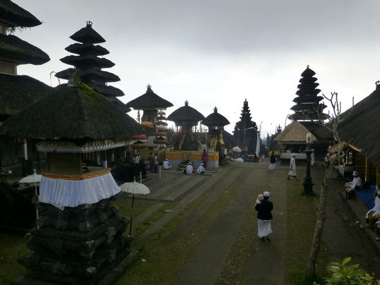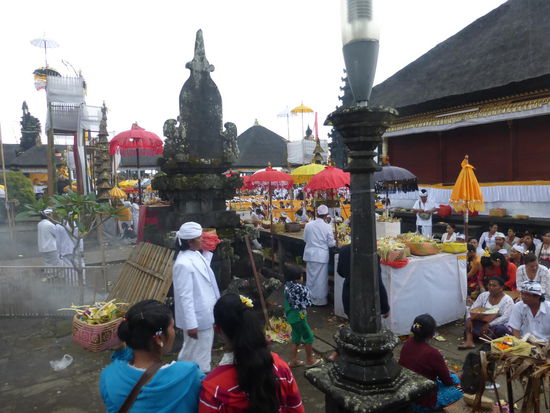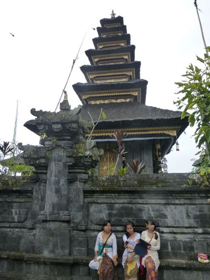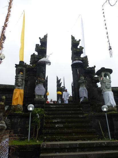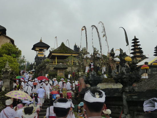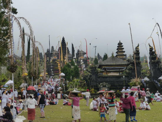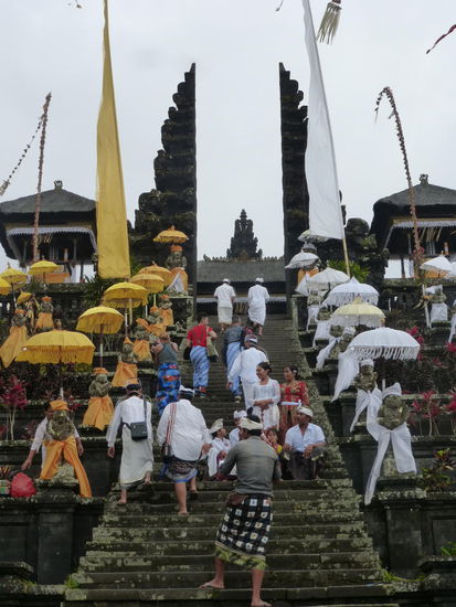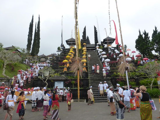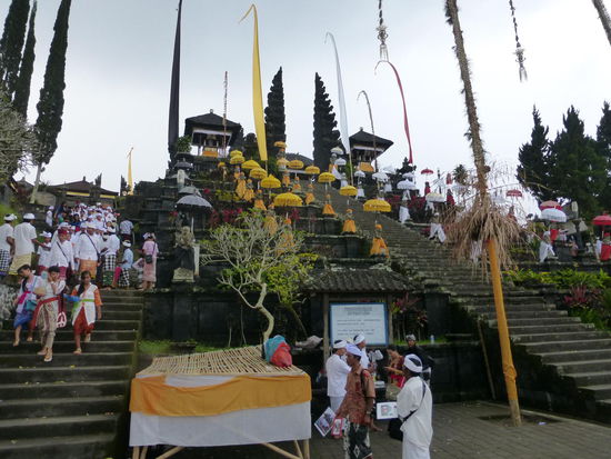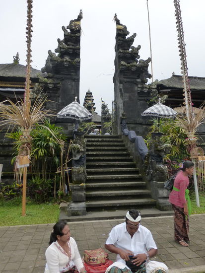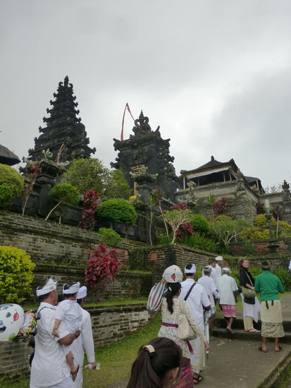 Unterhalb des über 3000 m hohen noch aktiven Vulkans " Gunung Agung " der das Zentrum der balinesischen Welt und Zentrum der Götter darstellt liegt auf 900 m der größte , älteste und heiligste Tempel auf Bali der " Pura Besakih " von den Einheimischen auch Muttertempel genannt. Die Anlage in der jedes Königshaus und jeder Familienclan einen eigenen Tempelerbauen ließ besteht heute aus fast 200 Bauwerken von denen der Pura Penataran Agung der bedeutendste ist. Er gehörte einst der Königsfamilie von Klungkung. In das Allerheiligste des Tempels dessen Ursprünge bis ins 8. Jh. zurückreichen dürfen nur Hindus hinein und in die Nebentempel bei angemessener Kleidung auch alle anderen Besucher. Vor dem Tempel bieten viele Händler Essen , Kleidung und Souvenirs an und auch Guides die man hier auch nicht unbedingt braucht streiten sich um Kundschaft. Außer am Tanah Lot Tempel habe ich nirgendwo so viele Touristen und Einheimische ( Balinesen und sonstige Indonesier ) gesehen wie hier. Es war ein unglaubliches Gewimmel aber irgendwie auch interessant.