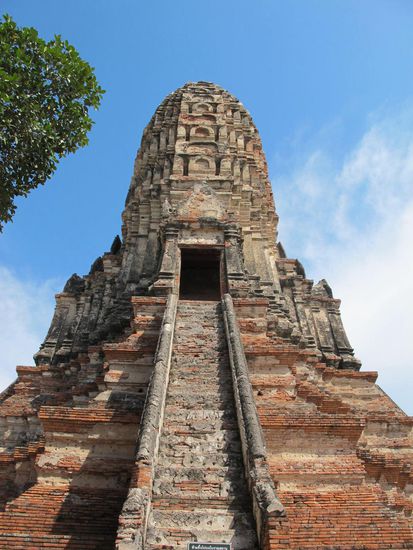 Wir mussten früh los, der Stray-Bus fuhr um 08:00 Uhr los. Das Morgenessen mit Ramona und Benni kam mir ein Bisschen vor wie eine Henkersmalzeit, das Ende unserer gemeinsamen Zeit stand vor der Türe. Der Abschied war hart! Irgendwie konnte ich mir nicht vorstellen nun nochmals so lange zu bleiben, wie wir schon unterwegs waren. Und überdies noch mit dem Unterschied, dass wir in dieser Zeitspanne nun keine bekannten Gesichter mehr sehen würden. 2.5 Monate hört sich nach wenig an, aber wenn ich mir überlege, was wir alles in den letzten 2.5 Monaten erlebt hatten, kommt es mir wie eine kleine Ewigkeit vor. Als das Abschiedsszenario vorrüber war, ging's dann los mit Stray. Es wartete bereits ein kleines Grüppchen von Backpackern vor dem Stray-Büro und so konnten wir uns noch ein wenig austauschen. Wir hatten zwei Guides dabei, einen sehr gut englisch-sprechenden Laotaner und eine Thailänderin, deren Englischkenntnisse nicht viel mehr als "Yes , no , und hello" hergaben. Mit zwei Minivans fuhren wir dann los, hatten genug Platz für Gepäck und Beine, denn die Busse waren bei weitem nicht gefüllt. So reist es sich gemütlich! Nach etwa zwei Stunden erreichten wir Ayutthaya, eine Stadt nördlich von Bangkok. Historisch ist die Stadt sehr interessant, denn es war einst die Hauptstadt von Thailand. Durch den Krieg mit Burma wurde ein Grossteil der Stadt jedoch zerbombt, so auch die Tempelanlage. In blinder Zerstörungswut wurde jedem einzelnen Buddha dort der Kopf abgeschlagen. Stray lud uns bei einem Hostel ab, in dem wir aber nicht übernachten würden, sondern unser Gepäck zwischenlagern konnten und etwas essen. Danach holten uns zwei Tuk Tuks ab und brachten uns zum Bootssteg von Ayutthaya, denn es stand eine Bootstour auf dem Programm. Mit zwei kleinen Bananenschalen brausten wir stromaufwärts zum ersten Tempel. Schon toll, alle sind direkt vom Wasser aus zugänglich. Der erste Tempel ist eine Mischung aus neu und alt. Tatsächlich stehen noch ganz ursprüngliche Mauern und Gebäude, es wurden zudem neue, pompöse Statuen und Türme gebaut. Dieser Mix verleiht dem Areal ein besonderes Flair und uns hat dieser Tempel sehr gut gefallen! Wenn ich übrigens nicht mehr jeden Namen der buddhistischen Tempel weiss und hier aufschreiben, bitte nicht böse sein! Alleine in Thailand gibt es ein paar Tausend Tempel, auch Wat genannt und die Namen sind nicht ganz so leicht zu merken!