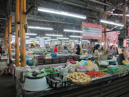 Überpünktlich fuhr der Zug um 08:15 Uhr im Bahnhof von Chiang Mai ein. Die nächste Tuk Tuk Fahrt folgte sogleich und mir wurde bewusst, wie wenig es mir fehlte, jedes Mal um einen guten Preis zu kämpfen und die hundert Angebote von den Fahrern abweisen zu müssen. Im Moment genoss ich es, dass ich zurücklehnen konnte und einen "all inklusive"-Transfer hatte. Das Hostel Deejay Backpackers lag mitten im Zentrum und wir mussten Gas geben, denn Damiano und ich hatten uns mit drei weiteren Damen aus unserer Gruppe, für einen Kochkurs angemeldet. Frisch geduscht, aber definitiv nicht ausgeruht, wurden wir vom Koch abgeholt. Er fuhr mit uns zu einem Markt, wo wir die verschiedenen Zutaten kennenlernen und probieren konnten. Zum ultimativen Thai-Kocherlebnis gehört ein Markteinkauf schon dazu! Als wir dann mit den frischen Kräutern, Gemüse und Früchten bei der Küche ankamen, verbreitete sich allgemeine Begeisterung. Die Kochnischen waren draussen! Jeder hatte seinen eigenen Gasherd mit Wok und Kelle. Es wurde ein Mega-Spass und war jeden Penny / Baht wert! Wir kochten jeder drei Gerichte + ein Dessert: Green Curry, Pad Thai und Fried Noodle with Cashewnuts + Sticky Rice with Mango. Boah, ich bin eine super Köchin! Es war mega lecker! Jeder konnte sein Gericht noch so schärfen wie er wollte und ich langte kräftig zu bei den Chilis. Bisher war ich ja schärfetechnisch leider sehr enttäuscht vom Thailändisches Essen gewesen, nun konnte ich endlich mal Gas geben! Wer mich kennt, weiss ja, dass ich es wirklich nicht spicy genug haben kann. Es staunte der Thai-Koch und ich fühlte mich fast ein wenig stolz, als er mir erklärte, dass ich viel schärfer als die Thailänder essen würde