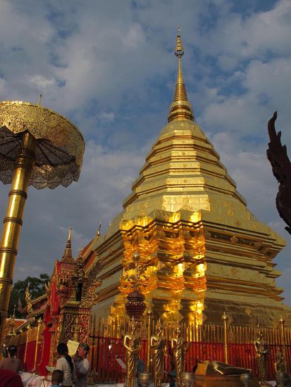 Am späteren Nachmittag wollten ein paar aus unserer Gruppe ein Tuk Tuk mieten und zu einem Tempel etwas ausserhalb fahren. Da schlossen wir uns natürlich an, nicht darauf gefasst, dass das Tuk Tuk eine schmale Strasse hoch in die Berge hinauffahren musste. Phu, dass war ein Ritt und das Curry und der Sticky Rice in meinem Bauch tanzten zusammen einen Samba! Ein paar hundert Stufen musste man noch hinauflaufen, bis man bei Eingangsportal stand. Der Wat Phra That Doi Suthep (ja, schon wieder musste ich den Namen im Internet nachschlagen!) ist ein eindrückliches Gelände mitten in den Bergen von Chiang Mai. Unser Highlight war es, als um 18:00 Uhr die Mönche sich zum Gebet versammelten. Die Stimmung hatte etwas mystisches: Die untergehende Sonne, die Ruhe, der Gesang der Mönche... Es lohnt sich also erst gegen Abend zu kommen. Bei uns war's purer Zufall, aber zu einem so perfekten Tag gehört wohl auch eine Portion Glück dazu. Zu guter Letzt gingen wir noch auf den Sunday Nightmarket, ein Strassenmarkt durch Chiang Mai, wo man ein paar tolle Schnäppchen findet.