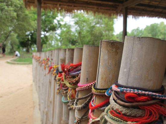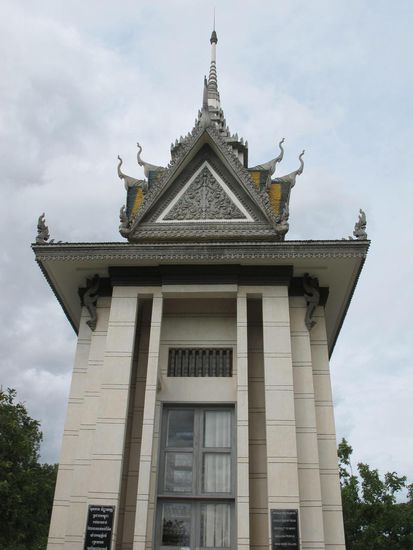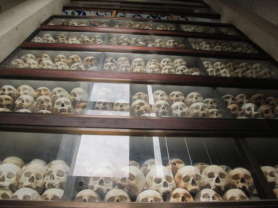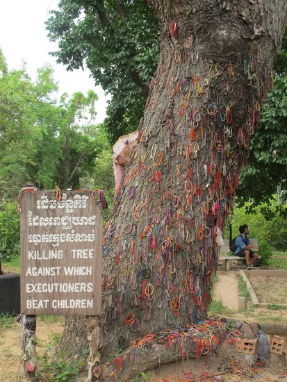 Nach diesem unfreiwilligen Bad konnten wir dann zum Glück in trockene Kleider steigen. Die Fahrt nach Kambodschas Hauptstadt dauerte etwa drei Stunden. Diese Zeit verschlief ich irgendwie und kam erst zu mir, als unser Guide etwas über unseren ersten Stop bei den Killing Fields erzählte. Da ich ja schon bei Battambang über die Khmer Rouge geschrieben habe, halte ich mich hier kürzer. Ich möchte aber vorweg nehmen, dass dies bisher nebst dem Besuch in Hiroshimas Atombombenmuseum, meine traurigste Reiseerfahrung war. Die Killing Fields sind das Gelände, wo tausende von Kambodschaner von ihren eigenen Landsmännern, den Khmer Rouge, umgebracht wurden. Mit einem Audio-Guide ausgerüstet, kann man selbständig dieses Areal betreten. Die unzähligen Gruben sind alles Massengräber, die ab 1980 nacheinander entdeckt wurden. Es wurden bisher 8895 Leichen gefunden. Leider liegen wohl immer noch tausende unentdeckte Leichen irgendwo unter dem Boden und bisher war es noch nicht möglich alle Knochen und Kleidungsfetzen zu entfernen. Einer meiner persönlich schlimmsten Momente dort war, als ich fast auf einen Zahn gestanden bin, der auf dem Weg lag. Es braucht wirklich Nerven, dies alles anzuschauen und ich war mir bis zum Schluss nicht sicher, ob ich durchhalten würde. Der Audio Guide liess uns in die Jahre 1975 - 1979 abtauchen und den Erzählungen von Überlebenden zu lauschen, während man über die Todesstätte von ca. 17'000 Menschen läuft, war hart. Das unmenschlichste und grausamste Denkmal steht mitten zwischen den Gräbern. Es ist der Killing Tree . An diesem (eigentlich normal aussehenden) Baum wurde Blut und Gehirnmasse von Babys gefunden. Die Khmer Rouge schlugen dort die Köpfe der Kinder gegen den Baum und warfen die Leichen in die nächst offenen Gruben. Der riesige Turm, genannt Stupa, am Eingang der Fields wurde relativ neu gebaut. Er beinhaltet hinter Glasscheiben tausende Schädel von gefundenen Leichen. Sie wurden sorgfältig gesäubert und wissenschaftlich nach Todesursache geordnet. Den Khmer Rouge war "erschiessen" zu teuer. Deswegen griffen sie zu anderen Methoden. Mit jeglichem Werkzeug wurden die Menschen erschlagen und so konnte man anhand der Löcher in den Schädeln die Todesursache einordnen (Tod durch Holzstab, Hacke, Hammer, und noch ganz anderes).