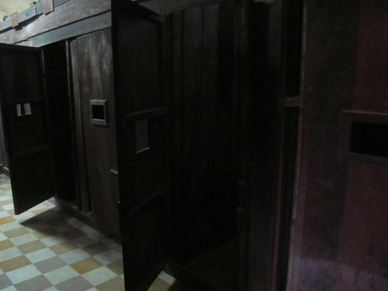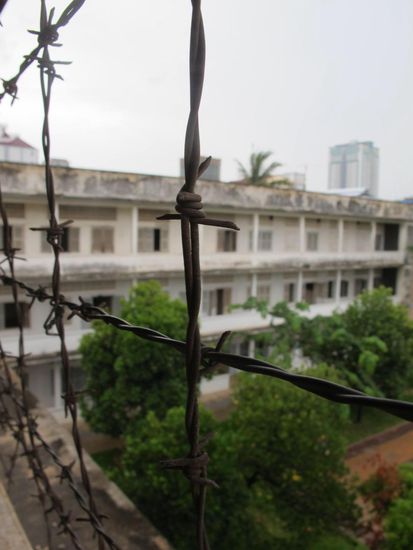 Die Verschnaufpause war kurz, aber tat trotzdem gut. Danach gingen wir ins S21. Das Gefängnis und Folterhaus der Khmer Rouge. Ich glaube dies gab mir dann den Rest. Am liebsten hätte ich geweint und gleichzeitig erbrochen, aber irgendwie blieb mir beides aus Schock im Hals stecken. Schlimm für mich als Lehrerin war der Gedanke, dass dies eigentlich ein Schulgebäude war. Aus Klassenzimmern wurden Folterräume gemacht, Kinderspielzeuge wurden umfunktioniert zu Folterwerkzeugen. Im einen Gebäude wurden aus Backstein oder Holz Einzelzellen gemacht. Immer noch sind die Blutflecken auf dem Boden zu sehen. Da die Khmer Rouge jeden einzelnen Gefangenen dokumentiert hatten mit Foto und Todesdatum, sind heute alle Gesichter, die in diesem Horrorgefängnis gelitten hatten, dort ausgestellt. Man sieht schmerzverzerrte Gesichter, traurige und leere Blicke, aber auch Wut und Trotz. Dies hat mich am meisten berührt: Die Wut über ihr Schicksal und die Machtlosigkeit ihren Henkern gegenüber.