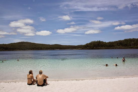 Der Lake McKenzie ist ein Süßwassersee mitten auf der Insel. Dort trafen sich die verschiedenen Touren, wodurch es sehr voll war.