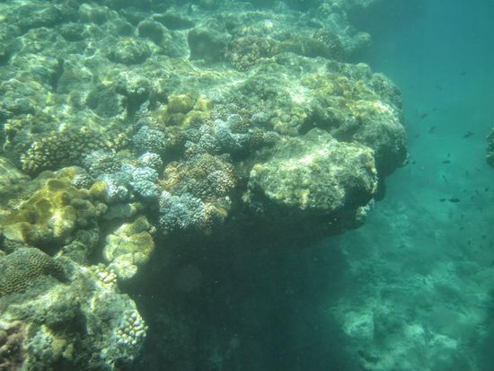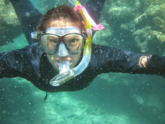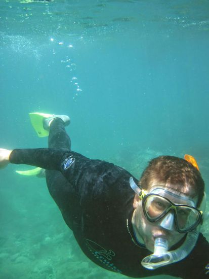 Jeder wurde gefragt ob er schwimmen könne und ob es irgendwelche medizinischen Bedenken gebe die einen vom Schnorcheln abhalten könnten. Wir sagten kurz Bescheid dass Sabine schwanger ist. Sie bekam ein Band als Markierung an den Schnorchel, so dass die Crew, die mit uns im Wasser blieb, direkt erkennen konnte dass sie "die Schwangere" war. Die Crew war echt zuvorkommend und ließ sogar extra eine Treppe am Schlauchboot herab um Sabine wieder einzuladen. Alle anderen mussten irgendwie eigenständig versuchen wieder reinzuklettern.