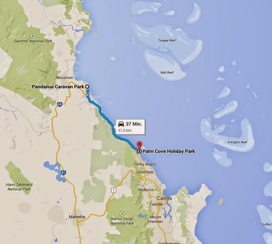 Am vorherigen Abend hatten wir in der Camp-Kitchen ein deutsches Paar kennengelernt. Wie immer sprachen wir über Reiserouten und die eigenen Erfahrungen von den besuchten Orten und Sehenswürdigkeiten. Wir waren uns noch nicht wirklich sicher, ob wir nun noch weiter in den Norden oder doch lieber schon zurück in Richtung Cairns fahren sollten. Die beiden empfahlen uns nach Palm Cove zu fahren. Dort hatten sie auf einem wunderschönen Campingplatz, der auch direkt am Strand lag, übernachtet.