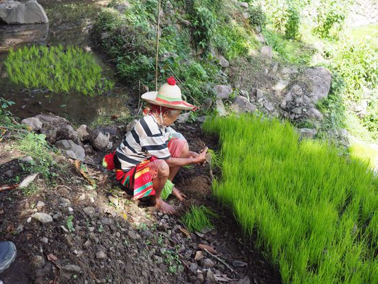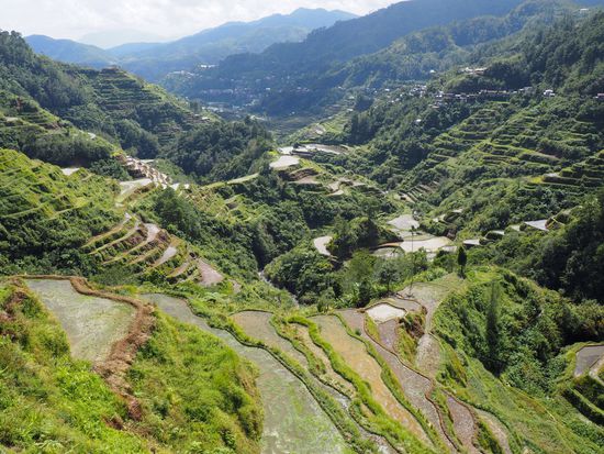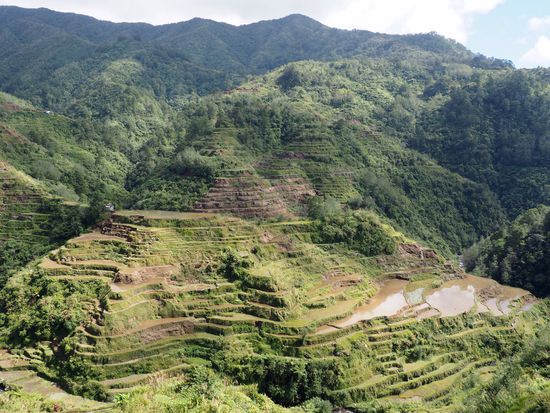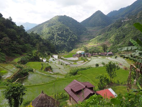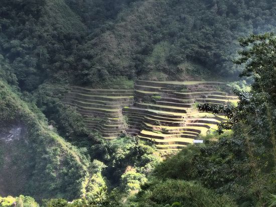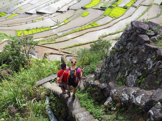 Die 2000 Jahre alten Reisterrassen der Ifugao wurden zum Weltkulturerbe der UNESCO ernannt und zählen zu den Weltwundern. Sie wurden mit primitiven Werkzeugen in die Hänge gebaut und mit einem ausgeklügelten Bewässerungssystem versorgt. Der Reisanbau heutzutage erfolgt immer noch in traditioneller Handarbeit – die Felder in den Terrassen werden nur einmal jährlich bestellt und somit bleibt eine nachhaltige Bodenkultur erhalten und Bio-Reis wird geerntet... leider nicht zu kaufen, da die Terrassen im Besitz von Familien im Dorf sind und der Reis nur für den Eigenbedarf reicht.