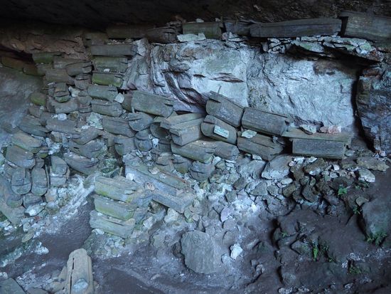 Auch am Eingang des „Lumiang Burial Cave“ sind einige Bewohner von Sagada bestattet – beim letzten Erdbeben sind die Hälfte der Särge abgerutscht
