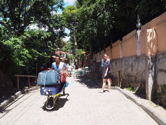 Am Bootsanleger warten schon die örtlichen Koffertaxis – autofreie Insel! Nix da – wir tragen unsere Rucksäcke wie immer selber – egal wie weit