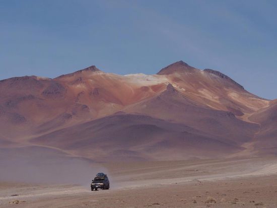 Um 4.30 Uhr ist Tagwache um den Sonnenaufgang am „Salar de Uyuni“ nicht zu verpassen. „Salar de Uyuni“ ist mit 12.000 km2 der größte Salzsee der Welt und liegt auf 3.650 m. In der Trockenzeit bilden bizarre, geometrische Salzformationen die Oberfläche. Wir fahren über die unvorstellbar große Fläche des unendlichen Nichts dem Sonnenaufgang entgegen - ohne Straße und Orientierungspunkte, zum Teil ohne Licht Die Stimmung ist atemberaubend – das frühe Aufstehen hat sich gelohnt!