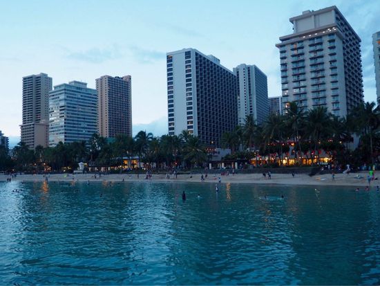 Mit dem Shuttle fahren wir durch Honolulu ins „Waikiki Beachside Hostel“ – gutes, erschwingliches Hostel nur wenige Gehminuten vom Waikiki Beach entfernt. Nach einer kurzen Stärkung mit „Musubi“ (Reis gefüllt mit Fisch und mit Seetang umwickelt) gehts gleich zum Waikiki Beach... super schöner Stadtstrand mit vielen Surfern.