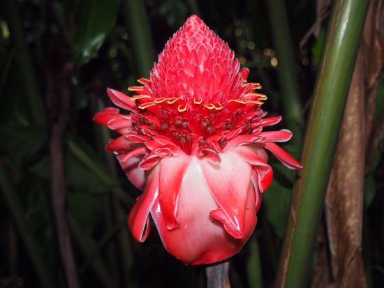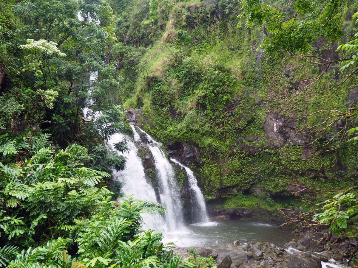 In der Früh füllen wir im lokalen Supermarkt unsere Vorräte auf und machen uns auf den Weg nach Hana. Der Hana Highway ist eine atemberaubend schöne Straße an der Nordostküste zwischen tropischen Tälern und hohen Felswänden, die eine umwerfende Aussicht nach der anderen bietet. Wir passieren nicht nur 54 einspurige Brücken, sondern auch viele wunderschöne Wasserfälle und auf kurzen Wanderwegen genießen wir die üppige Flora.
