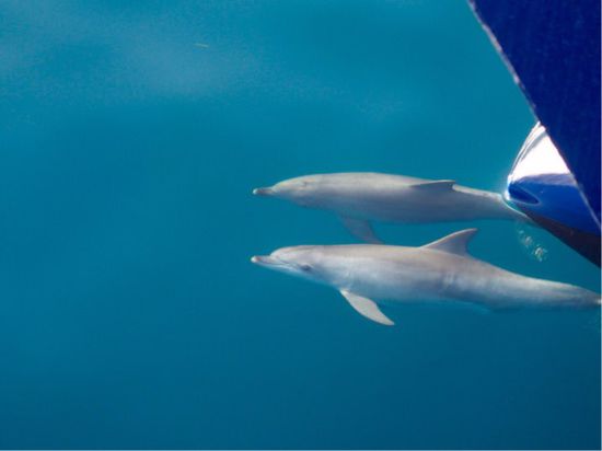 Auf der Überfahrt nach Kangaroo Island schwimmen zwei Delphine in der Bugwelle der Fähre – es scheint, als macht es ihnen Spaß beobachtet zu werden bzw. uns zu beobachten... wunderbar!