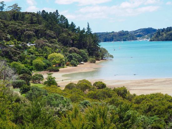 Nach einem kurzen Rundgang im Zentrum wandern wir den kurzen „Opua Bush Walk“ zu einem schönen Aussichtpunkt hinauf – von hier aus eröffnet sich ein ein schöner Blick auf die Bucht mit ihren rund 150 naturbelassenen Inseln.