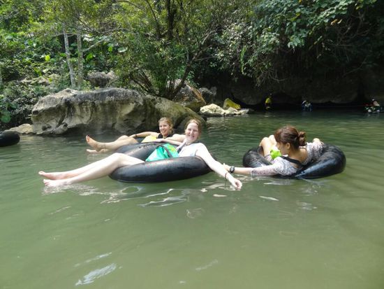 Mein Bauch hatte sich über Nacht noch etwas weiter beruhigt und so freute ich mich auf den Caving-Hiking-Kajaking Tag, der anstand. Die letzten Zweifel wurden fortgewaschen als ich abgeholt wurde und auf 3 supernette Gruppeneilnehmer traf - perfekt! Nach der Besichtigung dreier Höhlen mit der Stirnlampe ging es zu einem großen 'Picknickplatz', wo unser Guide uns ein Barbecue zauberte, das mit gebratenem Reis und einem Sandwich zusammen schon wieder fast zu viel des Guten war. Danach ging es zu einem echt lustigen Teil, nämlich an Seilen entlanghangelnd auf Tubingreifen in eine Höhle hinein! Nachdem wir alle den ersten Schock des kalten Wasser überstanden hatten, war es richtig lustig und leider viel zu kurz. Dutzende Gruppen von Asiaten waren gleichzeitig mit uns dort und man glaubt nicht, wie kindisch 50jährige Koreaner sein können, wenn man sie nur ins Wasser lässt