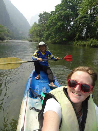 Nach dem Höhlenspaß ging es zum Trocknen erstmal zu Fuß zu und durch ein Mong Dorf, das zu meiner Beruhigung auch zu keiner Zirkusausstellung wurde, sondern einfach nur ein netter Spaziergang. Danach war es auch schon so weit, dass wir an den Startpunkt für die Kajaktour fahren konnten. Der Israeli aus meiner Gruppe entschloss sich kurzerhand auch fürs Kajaken, die anderen Mädels fuhren dagegen mit dem Auto zurück in die Stadt. Gut eineinhalb Stunden paddelten wir so, sehr gemächlich, auf dem Fluss dahin und kamen ins Kreuzfeuer so mancher koreanisch/japanisch/chinesischer Wasserschlacht (ich kann sie einfach nicht unterscheiden...)- gut, dass unsere Wertsachen sicher in den Oceanpacks verstaut waren. Ein Heidenspaß mit Traumkulisse! Jederzeit würde ich es nochmal so machen und eine der 'teureren' Touren buchen (diese übrigens war von VLT Travel)!