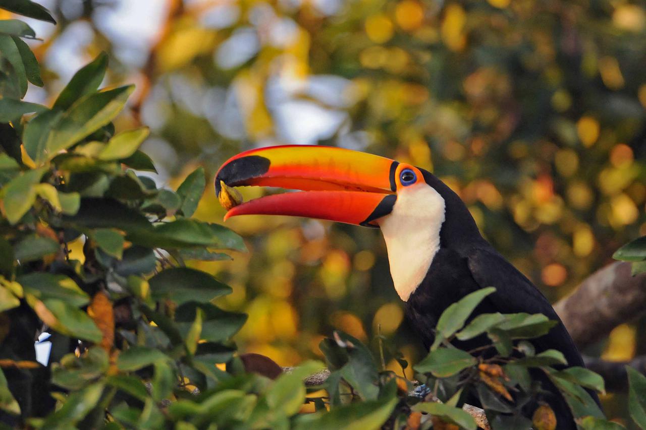 Auf einem der zahlreichen großen Bäume auf dem Hotelgelände sitzt frühmorgens ein Riesentukan, um sich an den Baumfrüchten gütlich zu tun.