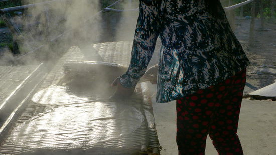 Neben der Besichtigung von Reisfeldern, der Reisnudelherstellung und sonstigen Plantagen am Uferrand, wissen wir auch endlich, wie ein Papaya"baum" aussieht, dass Mangos hier wachsen wie bei uns Apfelbäume und dass das grüne Zeug, was überall am Ufer schwimmt, sozusagen "Wassersalat" ist, der gerne in der Suppe gegessen wird.