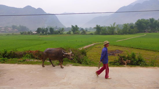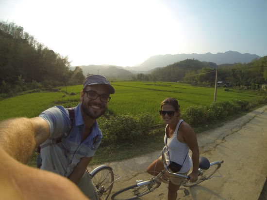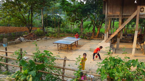 Voller Energie im Gepäck von der herrlichen Halong Bucht, stürzten wir uns direkt ins nächste kleine Abenteuer bzw. ins nächste Extremum. Nach dem Meer und dessen faszinierenden Felsformationen begeben wir uns in das Bergland Nordvietnams. Da unser Visum am 18.4 ablief und unser Flug auf die Philippinen am 17.4 ging, haben wir uns für einen kurzen Zweitagestrip nach Mai Chao, dem kleinen Bruder des größeren und touristischeren Sapa entschieden. Hier befindet sich zwar nicht der höchste Berg Vietnams, aber immerhin einige Berge, die 2000 Meter und mehr in den Himmel ragen und mit den grünen von Reisfeldern durchzogenen Tälern dazwischen eine wunderschöne Szenerie bilden. In dem Bus, in dem wir die einzigen zu sein schienen, die keine organisierte Tour gebucht haben, lernten wir direkt ein supernettes deutsches Paar (Basti und Kartrin) kennen, deren Wege wir in den nächsten zwei Tagen des öfteren Mal gekreuzt haben (oder auch umgekehrt). Angekommen in Mai Chao wurden wir erst mal mit einem kleinen Golfwagen weg von allen Bungalowschläfern zu unserem Gemeinschaftsschlafraum gebracht. Dem Mai Chao Green Valley View. Die verschiedenen Gruppen ethnischer Minderheiten, die hier in den Bergen leben, schlafen in sogenannten Stelzenhäusern aus Schutz vor Ungeziefer, Krabbeltier und Fluten. Da sind dann schon mal viele Generationen und viele Personen drin untergebracht. Bei uns warens halt viele Personen und viele Nationen. Etwas rustikal und einfach, aber hier passts perfekt her.