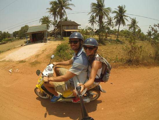 Erstes Ziel waren Tempelanlagen in Höhlen, von denen es unzählige gibt... wenn man sie findet. Dank vollem Tank, Karte, super Orientierungssinn aber vor allem total netten Einheimischen (wären uns am liebsten vorausgefahren bis zur Höhle) haben wir am Ende alles gefunden, was wir sehen wollten: die Höhle bei Climbodia (Kletterfelsen), die Tempelhöhle Phnom Chhnork (alter Backsteintempel in riesen Höhlensystem), den Secret Lake (wunderschöner See im Nirgendwo mit kleiner Bungalowsiedlung) und eine Kampotpfefferplantage.