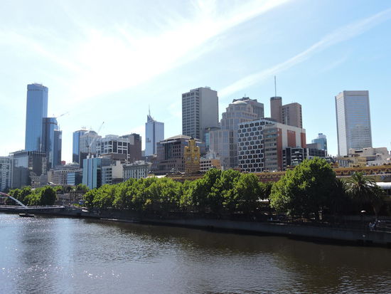 Mit der Linie 12 fahren wir wieder Richtung City - Mit der Tram wollen wir dann weiter Docklands und Waterfront fahren - hyper modernes Viertel - mit einer beachtlichen Skyline - Auch hier überall Vorbereitungen für Silvester. An den Haltestellen lesen wir, dass abends ab 18.30 - bis 1.30 nachts keine Straßenbahnen in die Innenstadt fahren - auch viele Straßen werden gesperrt sein. Jetzt aber ist überall reger Einkaufstrubel und die Straßen sind bei Sonnenschein voller Menschen.