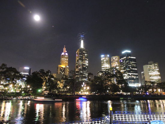 Im laufe des Abends ist das Flussufer voller Menschen, Familien mit Kindern, alle Nationalitäten, ausgestattet mit Picknickdecken und -körben. Uns wundert es sehr, dass am Flussufer weder Getränkestände noch "Fressbuden" zu finden sind - wenn man an die Fanmeile in Berlin zu Silvester denkt. Hier läuft alles sehr beschaulich und ruhig ab. Vom Ufer sehen wir viele geschmückte Boote, auf denen Partys stattfinden oder nur kl. Boote mit bunten Lichterketten. Um 21.30 h können wir schon das Familien-Feuerwerk im Yarra Bend Park von Weitem bestaunen. Um 22.00 h bekommt man kein Bein mehr am Flussufer an die Erde, und wir sind froh unseren Platz zu haben. Polizei und Security kontrollieren diesen Bereich.