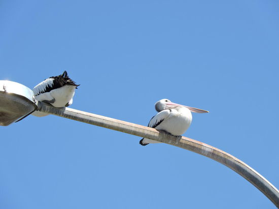 Bei der Abfahrt sehen wir viele Pelikane, die einfach auf den Straßenlaternen verweilen.