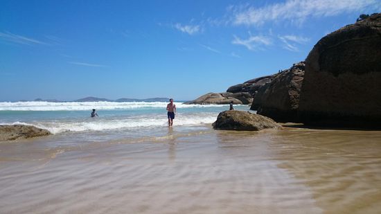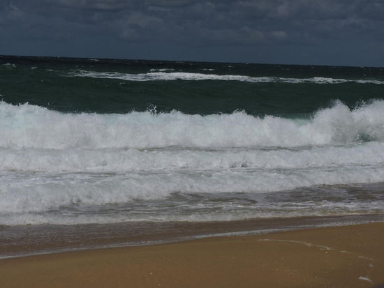 Sind fasziniert von den riesigen Felsen, dem langen Strand und dem tollen Wellengang.
