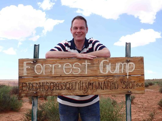 Und nun endlich waren wir nah dran: Monument Valley. Zuerst einmal fuhren wir über die Straße, die schon Forrest Gump im Film benutzt hat und fanden den Punkt, an dem er seinen Amerika-Lauf beendet hat. Ein sehr beliebtes Fotomotiv und so mussten wir eine Lücke zwischen den vielen Autos auf der Fahrbahn finden um das passende Bild machen zu können.