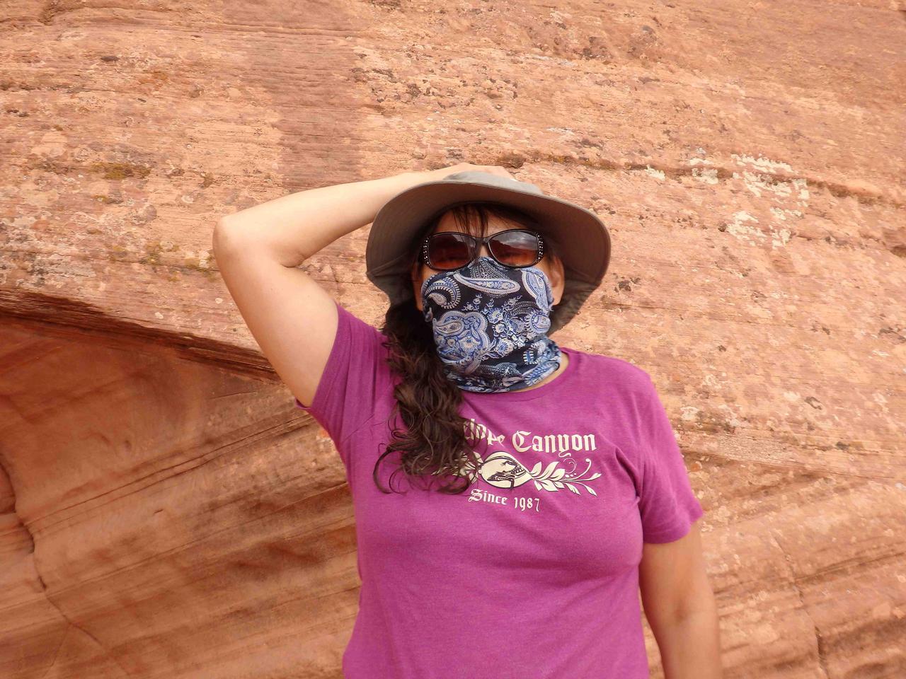 Sieht gefährlich aus, war aber sehr nett. Wegen des vielen Windes, der ihr den Sand in den Mund weht trug sie Mundschutz