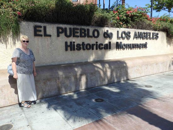 Nach einem guten Frühstück in Ruhe genossen und einem netten Gespräch mit Landsleuten, die sich über unsere ausgelesenen deutschen Zeitschriften freuten machten wir uns auf den Weg in den historischen Teil von LA. Natürlich mussten wir dafür wieder über den Highway. Wir dachten eigentlich, dass es dort am Sonntagmorgen ruhiger zugehen würde, aber das war leider nicht so. Es war fast genauso drubbelig, wie an den anderen Tagen. Der erste Halt war am Pueblo, dem spanischen Altstadtteil.
