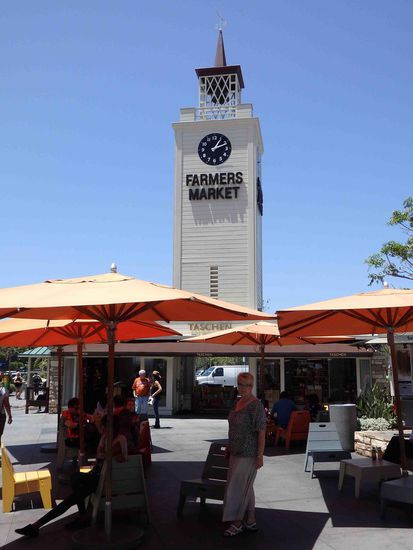 Eine weitere Sehenswürdigkeit ist der Farmersmarket, zu dem wir uns danach auf den Weg machten. Eigentlich war er wohl mal als echter kleiner Wochenmarkt gedacht, ist nun aber in kleinen Gassen lediglich eine "Fressmeile" und dahinter reihen sich tolle Geschäfte in einer wunderschönen Umgebung aneinander. Die Farben des heutigen Tages haben uns wirklich fasziniert: Der Himmel tiefblau und im Sonnenschein leuchten Häuser und Blumen. Eine alte Straßenbahn zog ihre Runden durch die Enkaufsstraße mit viel Gebimmel und die Menschen rundherum schienen die Stimmung und Atmosphäre zu genießen. Wir tranken einen Kaffee in der obersten Etage von Barnes & Nobel, einer riesigen Buchhandlung, die wir schon aus New York kannten. Vom Fenster aus hatten wir einen schönen Blick in die Einkaufsstraße und konnten die Menschen beim Bummeln beobachten.