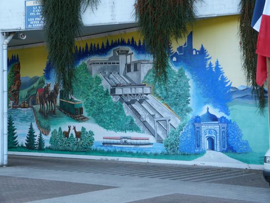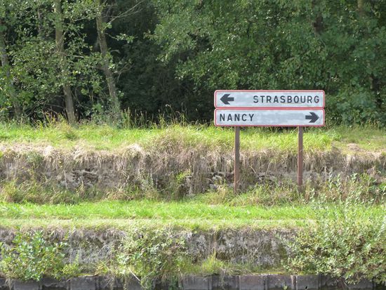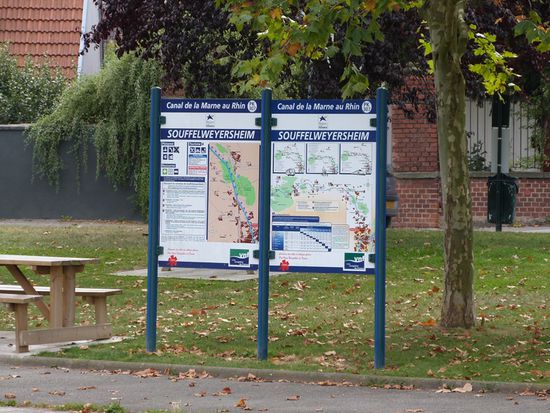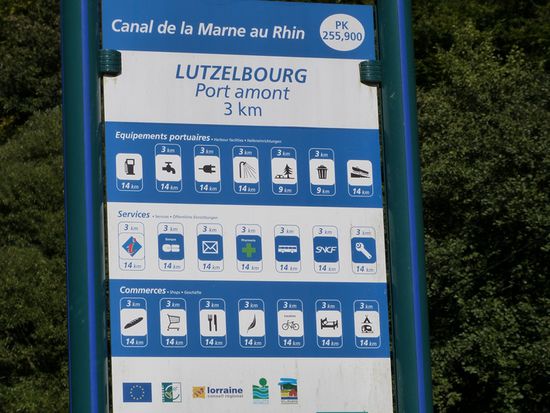 Eigentlich stehen am Schrägaufzug immer ganze Busladungen von Kiebitzen um sich das Schauspiel nicht entgehen zu lassen. Doch dieses Mal sind wir hier alleine. Einfahren, festbinden, ein Blick des Service-Mannes auf unsere Vignette und schon setzt sich die Anlage in Bewegung. 17 Schleusen ersetzt der Aufzug und ersparte den Pénichen einen ganzen Tag Arbeit. Die alte Schleusenkette wird als Industriedenkmal erhalten und kann auch besichtig werden. Irgendwo erinnert uns ein Schild „Bienvenue en Alsace“, dass wir Lothringen verlassen haben und nun im Elsass sind, also auf der klassischen Sauerkraut-Tour. Der Canal Marne-au-Rhin ist anders als die anderen Kanäle in Frankreich. Er ist völlig in Ordnung. Seine Ufer mit Spundwänden befestigt, kein Unterwasserbewuchs, Schleusen, die die meiste Zeit funktionieren, auch die Höhe von 3,50 m stimmt. Auch hier gilt: jeder kleine Ort bietet einen Anleger oder Hafen. Auch in „freier Wildbahn“ sind gemähte Rasenplätzchen, mit Picknick-Tischen und Pollern in der Wiese. Man kann sich wochenlang hier aufhalten ohne arm dabei zu werden.