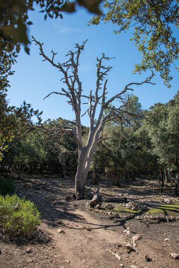 Das Thermometer zeigt schon wieder 29 Grad, aber wir sind größtenteils im Steineichenwald unterwegs. Wir bewegen uns auf einem alten Karrenweg, vorbei an alten Kohlenmeilern, in Serpentinen bergauf bis wir einen Aussichtspunkt erreichen, den Mirador de Can Costa.