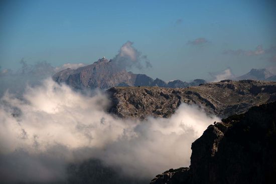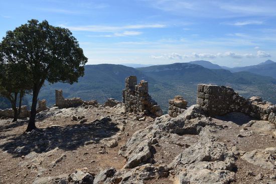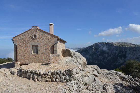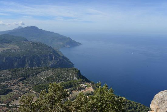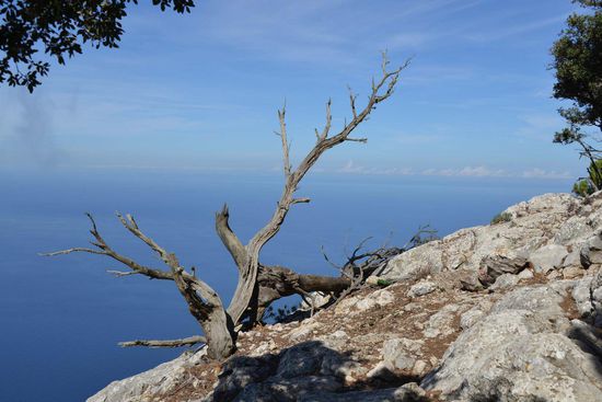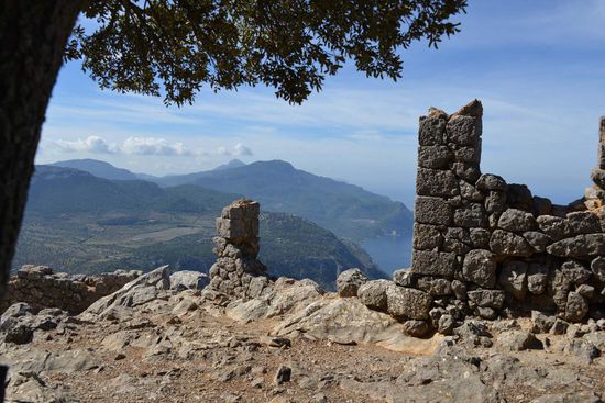 Geschützt durch eine fast verfallene zinnengekrönte Mauer fällt unser Blick 400 m senkrecht in die Tiefe. Auf dem Berggrat geht es weiter zum Gipfel Pouet (855 m) mit Blick auf die Ebene von Palma. Ein kleines Stück weiter auf einem höheren Gipfel (Talaia Vella) steht eine entzückende Schutzhütte die ebenfalls Ludwig Salvador errichten ließ. Hier hat man natürlich einen noch besseren Ausblick. Wir sehen nach Norden Richtung Deià und rechts davon die Felswand des Caragolì (945 m).