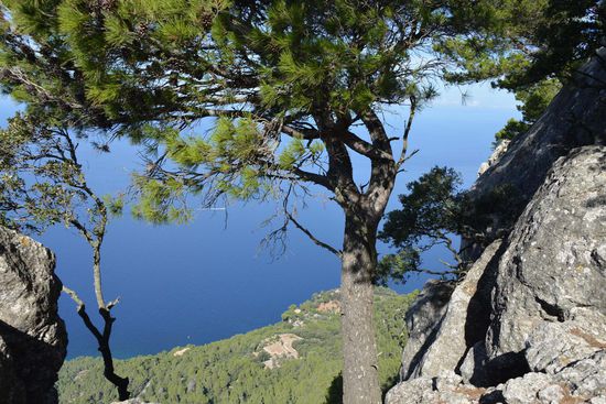 Jetzt haben wir nur noch den Abstieg. Zuerst über einen kurvigen Pfad mit losem, rutschigem Gestein und weiter durch den Wald bis zum bereits bekannten Brunnen Font des Pouet. Den restlichen Weg bis zu unserem Auto auf dem Parkplatz in Valldemossa gehen wir wieder in der prallen Sonne - selber schuld, wenn wir von ca. 11:00 bis 14:30 wandern gehen müssen...