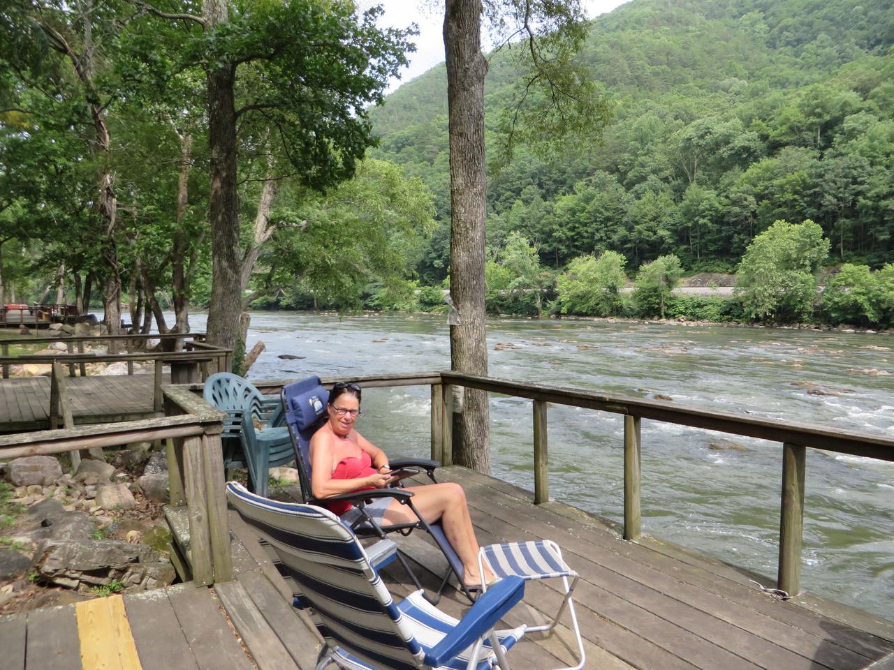 In Hot Springs wollten wir deshalb auf den Platz, aber der gefiel uns nicht, also sind wir noch etwa 20 km weitergefahren und stehen jetzt direkt am French Broad River. Wir hatten eine schöne Plattform auf der wir sitzen konnten und den Fluß beobachteten. Denn nach ungefähr einer Stunde wurde es immer mehr Wasser und uns wurde schon ganz mulmig. Da es auch ganz schwarz wurde, sind wir erstmal ein Stück vom Ufer weggefahren.