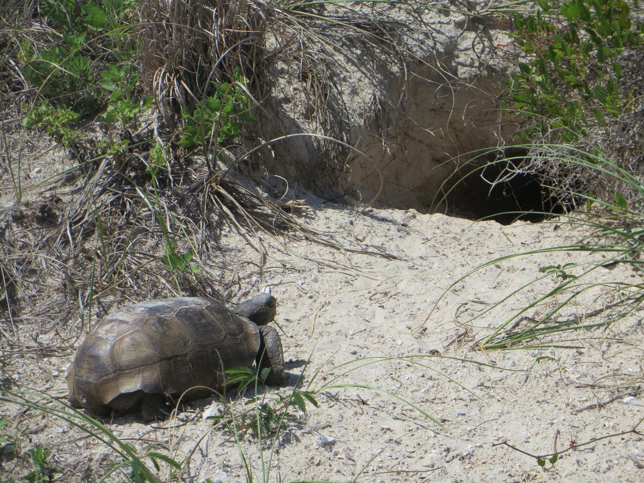 Wir fahren an den Strand und machen uns dann zu Fuß auf den Weg und laufen über lange Holzstege durch ein Naturschutzgebiet. Wir sehen eine große Schildkröte, die in einem Affenzahn zu ihrer Höhle läuft.