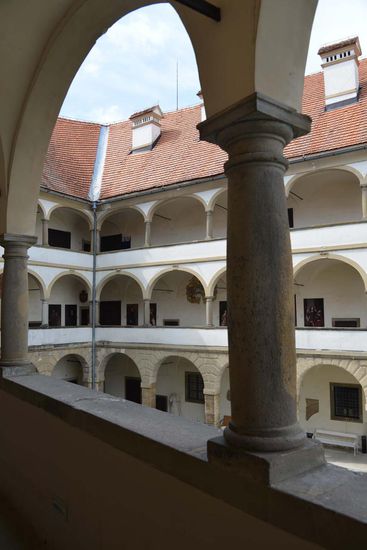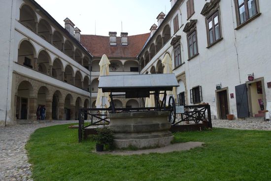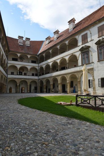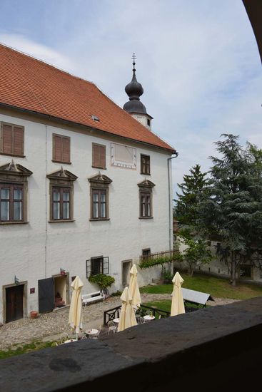 Die Essenden verspäten sich um 20 Minuten und so kommen wir erst um 14:15 zur versprochenen Burgführung. Die örtliche Reiseleitung führt uns durch das Schloss. Zuerst sehen wir eine Kostümsammlung für Erntedankfeste und Wintervertreibung. Weiter geht es zu einer Waffensammlung und zu einer sehr interessanten Musikinstrumentensammlung. Die Burg wurde im 12. Jhd. vom Salzburger Bischof erbaut. Es waren auch Schotten, Stubenberger und schließlich auch die Familie Herberstein im Besitz dieses Anwesens. Draußen hat man natürlich einen wunderbaren Überblick über die Stadt.