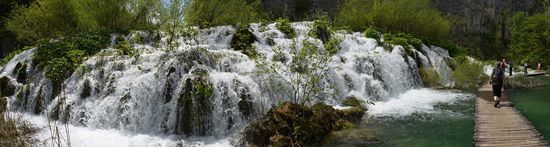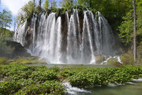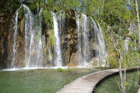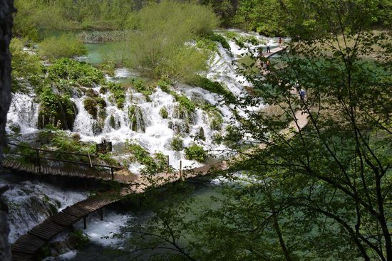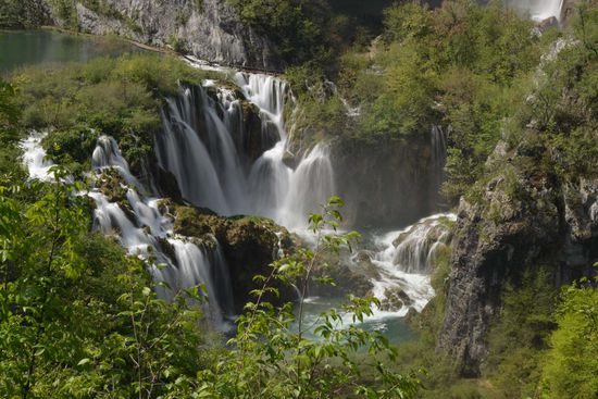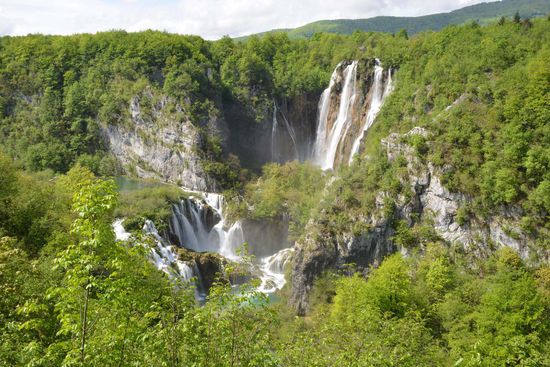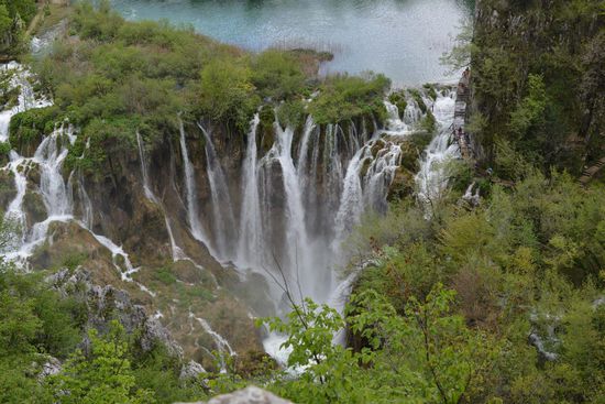 Heute besichtigen wir nur den unteren Teil, da durch die starken Regenfälle der letzten Tage die Stege teilweise noch überschwemmt sind. Aber kein Nachteil ohne Vorteil: es gibt sensationell viel Wasser! Und so bewundern wir gleich einmal den höchsten Wasserfall des Parks, den Veliki Slap, der 78 m in die Tiefe stürzt.
